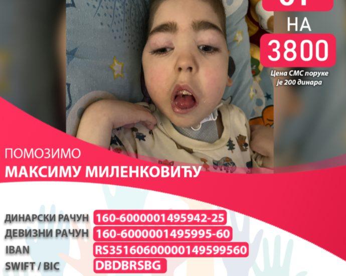 Porodica sedmogodišnjeg Maksima Milenkovića ponovo moli javnost za pomoć. Iako je deo sredstava već prikupljen, pomoć je i dalje neophodna za njegovo svakodnevno lečenje, rehabilitaciju i osnovne životne potrebe. Tokom akcije „Maraton za život“ prikupljena su sredstva namenjena genskoj terapiji u Berlinu. Ta sredstva su namenski uplaćena, ali genska terapijaДаље…