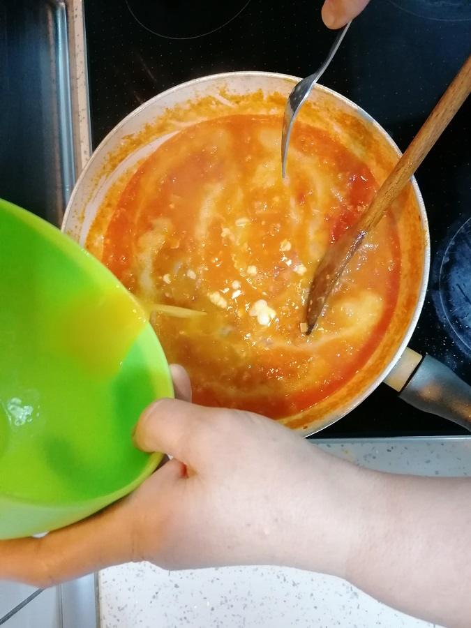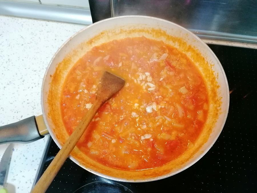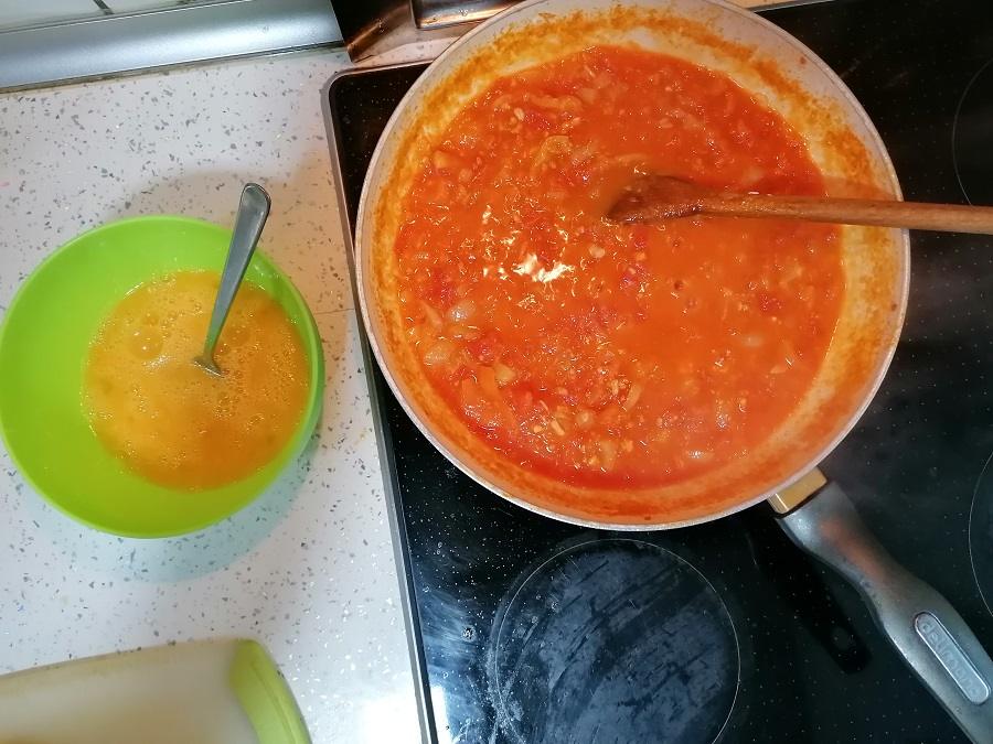 Насецкати ситно свежу паприку У тигањ где је пропржен парадајз, како би испарила течност, додати паприку и пржити још десетак минута Пред крај пржења додати мало брашна, али и соли, може и мало бибера иситно насецканог белог лука Пржити још неколико минута, ако је парадајз мали кисео, можете додати на ову количину и кашику шећера Припремити 4 јаја или по жељи мање или више, ко како воли сипати јаја у прженију и пржити јој пет минута